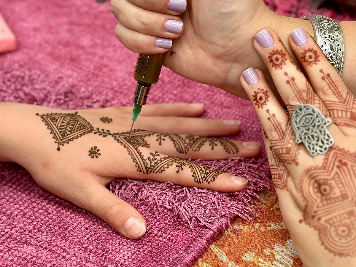 Vanuit cultureel perspectief vindt een henna ritueel plaats tijdens overgangsfasen in het leven van een vrouw. Dit biedt gelegenheid tot vieringen waarbij henna letterlijk centraal staat. De hennapoeder of blaadjes worden mooi opgemaakt in een schaal midden op de tafel gezet. Daaromheen vinden de festiviteiten plaats. Ik breng de henna intuïtief aan en eer de traditie door met een glazen spuit met stompe naald te werken. een techniek die langzaam aan het verdwijnen is.